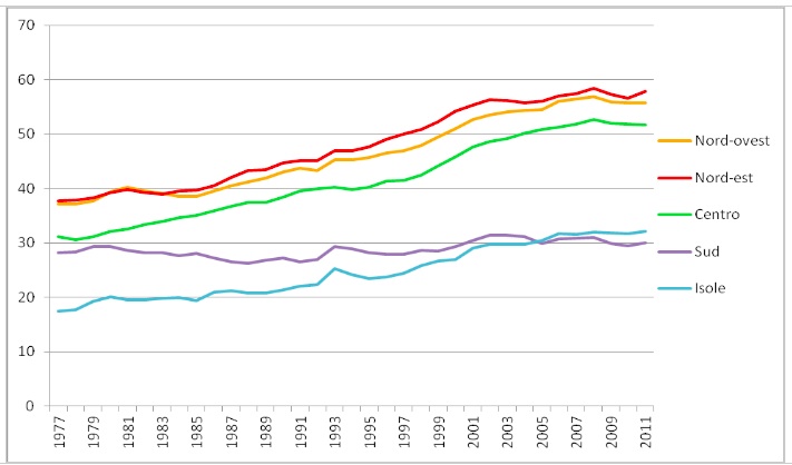 Figura1 – L’andamento del tasso di occupazione femminile (15-64) in Italia per macroaree, 1977-2011 (%)