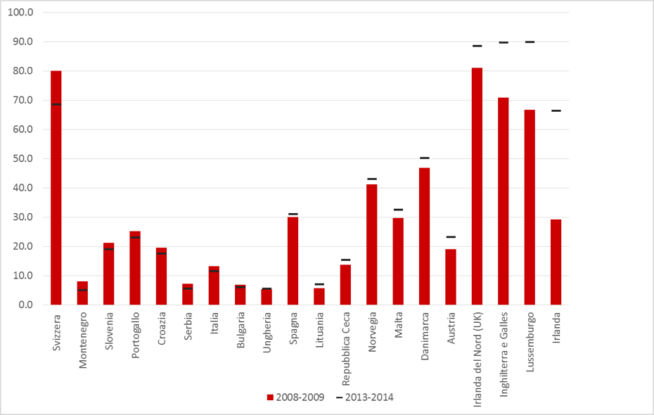 Per quanto parziali, dunque, i riscontri di fonte Eurostat sugli anni della crisi non sono tali da smentire i timori sollevati dall’indagine FRA. Ricordiamo però che l’indagine non riguarda il femminicidio, che viene invece rilevato dalle serie Eurostat. Secondo quest’ultima fonte, la prevalenza del femminicidio (casi in rapporto alla popolazione femminile) è scesa negli anni di crisi probabilmente seguendo un percorso di più lunga durata.