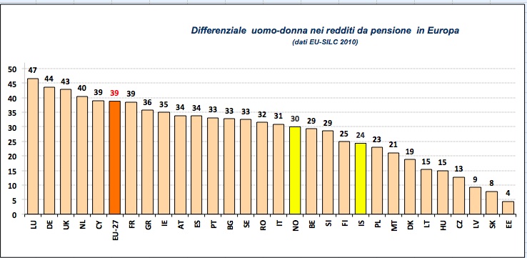 1 Seguendo la convenzione adottata dalla Commissione Europea definiamo differenziale (gap) per sesso nei redditi da pensione la differenza uomo-donna nell’ammontare lordo (mensile o annuale) dei rispettivi redditi medi da pensione calcolata in percentuale all’ammontare medio maschile. La popolazione di riferimento è maggiore di 65 anni. Secondo i dati tratti dall’indagine comunitaria EU-SILC 2010 tale differenziale ammontava al 31% per il nostro paese. Secondo le elaborazioni ISTAT dei dati INPS il differenziale era invece pari al 30% nel 2011 per la popolazione superiore ai 64 anni (nostre elaborazioni sulla Tabella 3 della nota ISTAT reperibile a http://www.istat.it/it/archivio/97147).