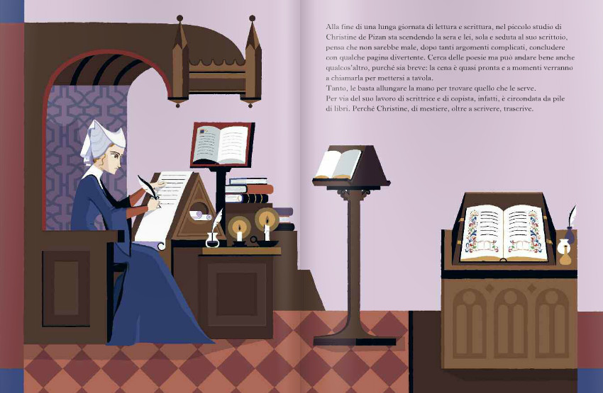 Qui sopra una pagina tratta da Christine e la città delle dame, appena uscito per Laterza nella collana dedicata ai lettori e alle lettrici più giovani (di Silvia Ballestra con illustrazioni di Rita Petruccioli)