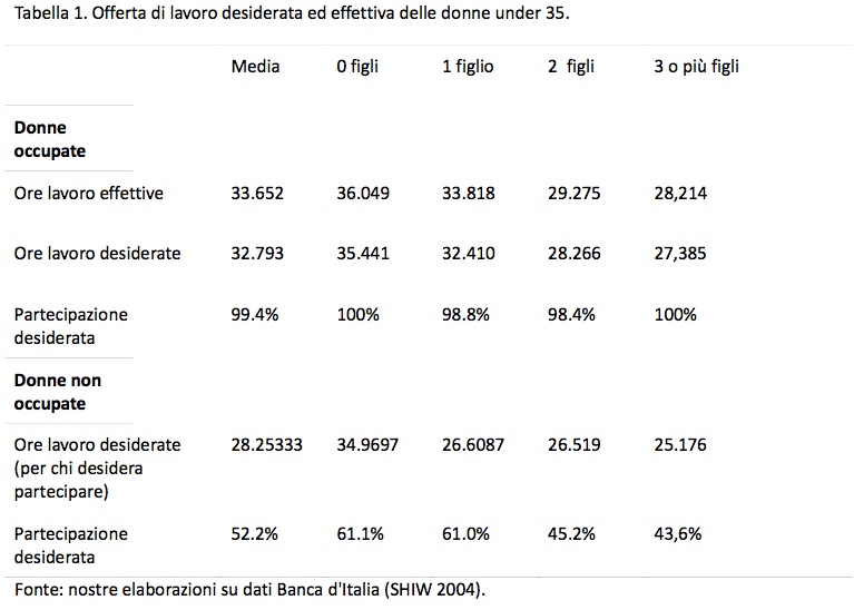 In Italia le cifre sul lavoro femminile sono, si sa, allarmanti. La percentuale di donne occupate si attesta intorno al 46% , contro il target (non raggiunto) di Lisbona al 60%1. Diverse motivazioni possono essere alla base di tale evidenza. In particolare, la bassa partecipazione femminile al mercato del lavoro può essere il frutto di decisioni personali e familiari, oppure può essere determinata dal contesto economico e, nello specifico, da elementi di rigidità del mercato del lavoro2. Un'indicazione riguardo la distanza tra preferenze ed offerta di lavoro effettiva emerge da un nostro recente studio (Rossi e Trucchi, 2011) che utilizza i dati di Banca d’Italia (SHIW) per il 2004 e confronta la partecipazione al mercato del lavoro e la sua intensità con l'offerta di lavoro "desiderata". Per l’anno 2004, infatti, la banca dati presenta non solo informazione riguardo al numero di ore lavorate ma anche quelle desiderate. Nel nostro campione, il 60% delle donne tra 25 e 45 anni lavora.