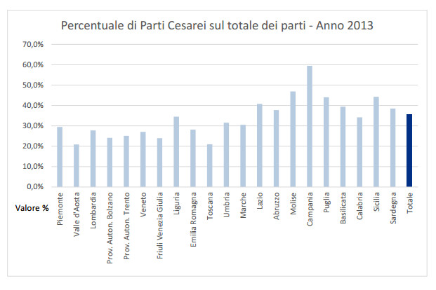 Nel 2013 i cesarei sono stati in media il 35,5% dei parti totali, con notevoli differenze regionali "che comunque evidenziano che in Italia vi è un ricorso eccessivo al parto per via chirurgica" si legge nel rapporto.
