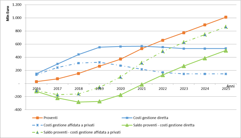 E infatti se si costruisce la simulazione ipotizzando di affidare la gestione del servizio di tutti i nuovi posti di asilo nido pubblici a soggetti privati opportunamente selezionati si verifica che il punto di pareggio del progetto di investimento viene anticipato di quasi due anni rispetto al caso in cui invece la gestione delle strutture sia interamente effettuata tramite personale interno. Nella figura sottostante sono rappresentati gli andamenti dei proventi del piano (linea arancione) insieme a quelli dei costi nel caso della gestione interamente diretta (linea continua azzurra) o interamente indiretta (linea azzurra tratteggiata) e i relativi saldi (in verde). Il coinvolgimento dei privati nella gestione delle nuove strutture realizzate può consentire di migliorare la fattibilità del progetto, rendendolo remunerativo in tempi più rapidi.