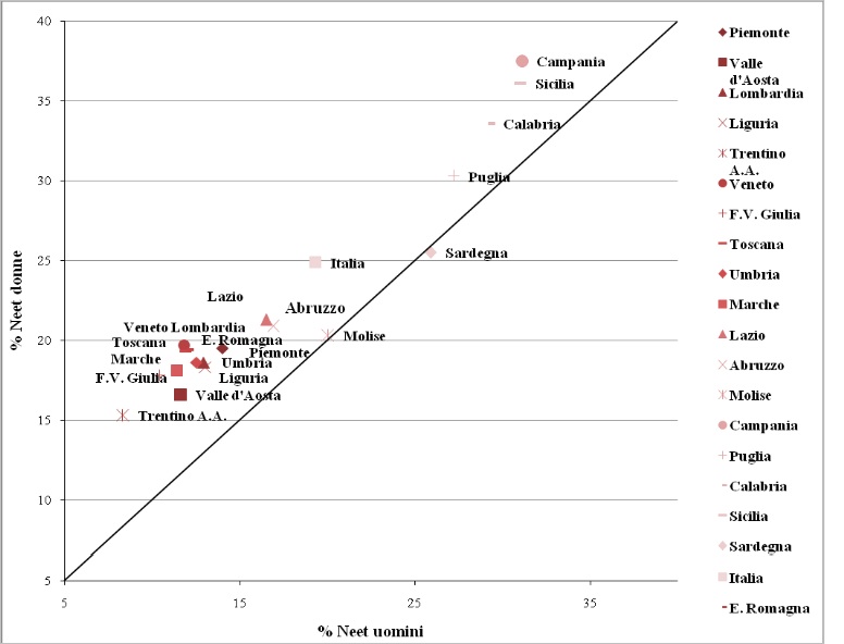 Scendendo al dettaglio regionale, è possibile rappresentare la relazione tra valori percentuali dei Neet maschi e Neet donne (Figura 1). Prendendo come riferimento la bisettrice, corrispondente ai punti in cui vi è uguaglianza tra i due tassi, è possibile notare come in tutte le regioni ad eccezione della Sardegna, i valori si trovino al di sopra della bisettrice evidenziando dei tassi Neet femminili sempre superiori a quelli maschili.