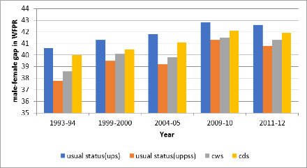 L'ultimo decennio ha visto un considerevole aumento del numero di giovani donne in età lavorativa che si sono iscritte alle scuole secondarie (il 25,87% nella fascia di età 15-24 anni frequentava istituti scolastici nel 2011-12). Come mostrano molti studi, la giovane età è quella in cui le donne partecipano più intensamente al mercato del lavoro in India. Inoltre, la natura risparmiatrice di lavoro della crescita economica non ha creato abbastanza posti di lavoro in settori che avrebbero facilmente potuto includere le donne, soprattutto nelle aree rurali. Nonostante l'insufficiente creazione di posti di lavoro, i redditi delle famiglie sono aumentati, il che ha potenzialmente ridotto la partecipazione delle donne, soprattutto nelle attività sussidiarie, a causa del cambiamento delle preferenze. Si parla di effetto reddito per dire che all’aumentare del reddito delle famiglie, le donne possono aumentare i propri consumi senza bisogno di lavorare. Infine, sebbene la maggior parte delle donne in India lavori e contribuisca all'economia, gran parte del loro lavoro è non documentato o non riportato nelle statistiche ufficiali. Ancora più che altrove, il lavoro delle donne tende così a essere sottostimato.