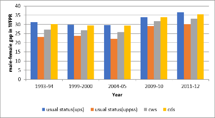 Inoltre, in contrasto con le tendenze presenti nell’economia globale ormai da alcuni decenni, l'India ha assistito a un ulteriore calo dei tassi di occupazione femminile rispetto al già basso tasso di anni fa. La figura 1 mostra il divario di genere nei tassi di partecipazione al mercato del lavoro fra aree urbane e rurali nel corso del tempo: ad eccezione del periodo dal 1999-00 al 2004-’05, quando la partecipazione al lavoro delle donne residenti sia nelle aree rurali che urbane è aumentata del 2-3%, c'è stata una massiccia diminuzione nella partecipazione lavorativa delle donne residenti in aree rurali, che ha raggiunto i 12 punti percentuali negli anni 2004-05 e 2009-10. Ciò si evidenzia nell’aumento del gap di genere per tutti i livelli di istruzione. Un simile declino non ha precedenti nella storia del paese. Ciononostante, nel periodo successivo, si è assistito a una ulteriore riduzione della partecipazione delle donne nelle aree rurali: -2% dal 2009-10 al 2011-12, mentre nelle aree urbane la partecipazione delle donne è aumentata, ma solo dell'1%.