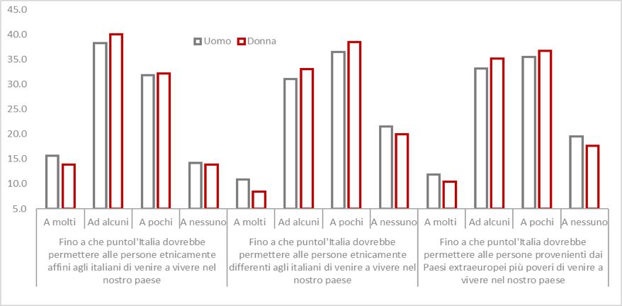 Le donne tendono, in ogni caso, a esprimere un giudizio meno estremo rispetto agli uomini. Sia se ci si riferisce agli stranieri di etnia simile o differente agli italiani, sia nel caso di stranieri provenienti da paesi poveri, gli uomini con maggiore frequenza rispetto alle donne forniscono posizioni estreme: “o tutti o nessuno”.