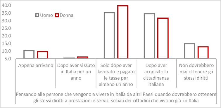 Soltanto il 10% della popolazione, senza sostanziali differenze di genere, crede che gli stranieri che vengono a vivere in Italia debbano avere gli stessi diritti a prestazioni e sevizi sociali degli italiani già dal loro arrivo. La prevalenza della popolazione indagata sostiene che la parità di diritti possa essere concessa a seguito di almeno un anno di lavoro (e di “pagamento delle tasse”). La quota di quanti sostengono che gli stranieri non debbano mai ottenere gli stessi diritti degli italiani è superiore rispetto a quanti credono che l’acquisizione di pari diritti debba avvenire già dall’arrivo in Italia e si attesta al 14%. Anche in questo caso, gli uomini tendono a collocarsi più delle donne nelle posizioni estreme della distribuzione (soprattutto nel caso di non concedere mai stessi diritti).