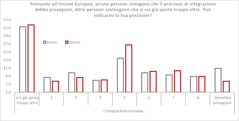 Già prima dello scontro aspro del governo italiano con i vertici comunitari sulla quota di deficit necessaria a garantire il mantenimento delle promesse elettorali, una percentuale elevata di popolazione (pari al 21.5%) sosteneva che l’”integrazione europea si è spinta troppo oltre”. Più in generale, nella scala di punteggio associata alle risposte al quesito, si osserva una minor frequenza di risposte che sostengono la necessità di dover continuare il processo di integrazione. Anche in questo caso le donne esprimono giudizi meno estremi degli uomini, collocandosi con più frequenza su posizioni intermedie.