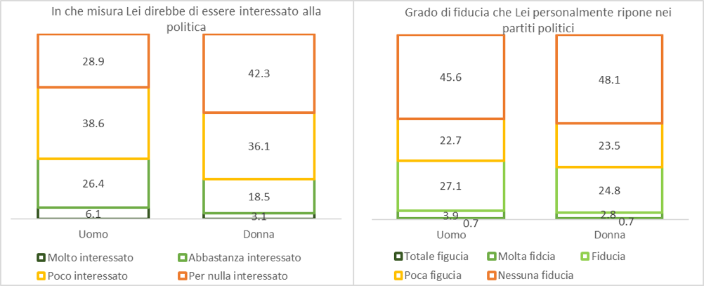 Sul grado di fiducia rispetto ai partiti politici, il dato non è più confortante. Totale o molta fiducia è espressa solo dal 4% delle persone, mentre nessuna o poca fiducia è riferita dal 68% delle persone. In questo caso le differenze di genere risultano meno marcate rispetto al quesito sull’interesse per la politica, ma le donne tendono ad esprimere giudizi maggiormente negativi rispetto agli uomini.