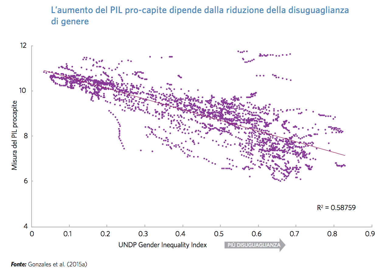 Eppure le diseguaglianze di reddito sono in grado di mettere a repentaglio la crescita di intere economie, ricorda il rapporto che citando, tra gli altri, uno studio del 2015, mostra in un grafico come l’aumento del Pil pro-capite sarebbe legato proprio alla riduzione della disuguaglianza di genere.