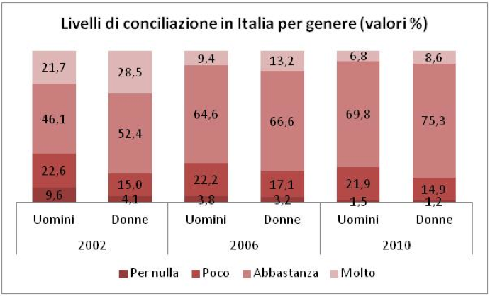 I dati sulla qualità del lavoro in Italia dal 2002 al 2010 hanno invece in parte confermato una maggiore predisposizione femminile nei confronti della conciliazione, e in parte rilevato dei lievi ma interessanti mutamenti da parte degli uomini.  Le dichiarazioni delle donne sui livelli di conciliazione nel complesso sono mutate poco, ma vi è stata una variazione in termini di qualità dei livelli di work life balance. Nel corso degli anni, invece, forse anche per effetto di una maggiore attenzione e sensibilizzazione dell’universo maschile verso gli aspetti che riguardano la vita privata e familiare, tra gli uomini è stato possibile rintracciare un crescente coinvolgimento. La percentuale di coloro che dichiaravano di conciliare poco o per nulla è passata dal 32% del 2002 al 23% nel 2010 (Fig.2)