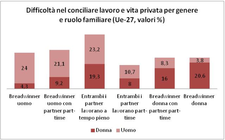 Le politiche di work life balance andrebbero quindi riproposte in modo neutro, come avviene in molti paesi nord-europei, e dovrebbero iniziare a fare i conti con le nuove forme (atipiche) di accesso al mercato del lavoro trasformandosi da questione di “genere” a materia legata all’ “individuo”. I dati dell’ultima European Working Conditions Survey condotta da Eurofound  nel 2010 per esempio hanno evidenziato come in generale nei paesi europei le difficoltà nel conciliare il lavoro con la vita privata varino non tanto in base al genere quanto rispetto al ruolo ricoperto all’interno della famiglia (Fig. 1).