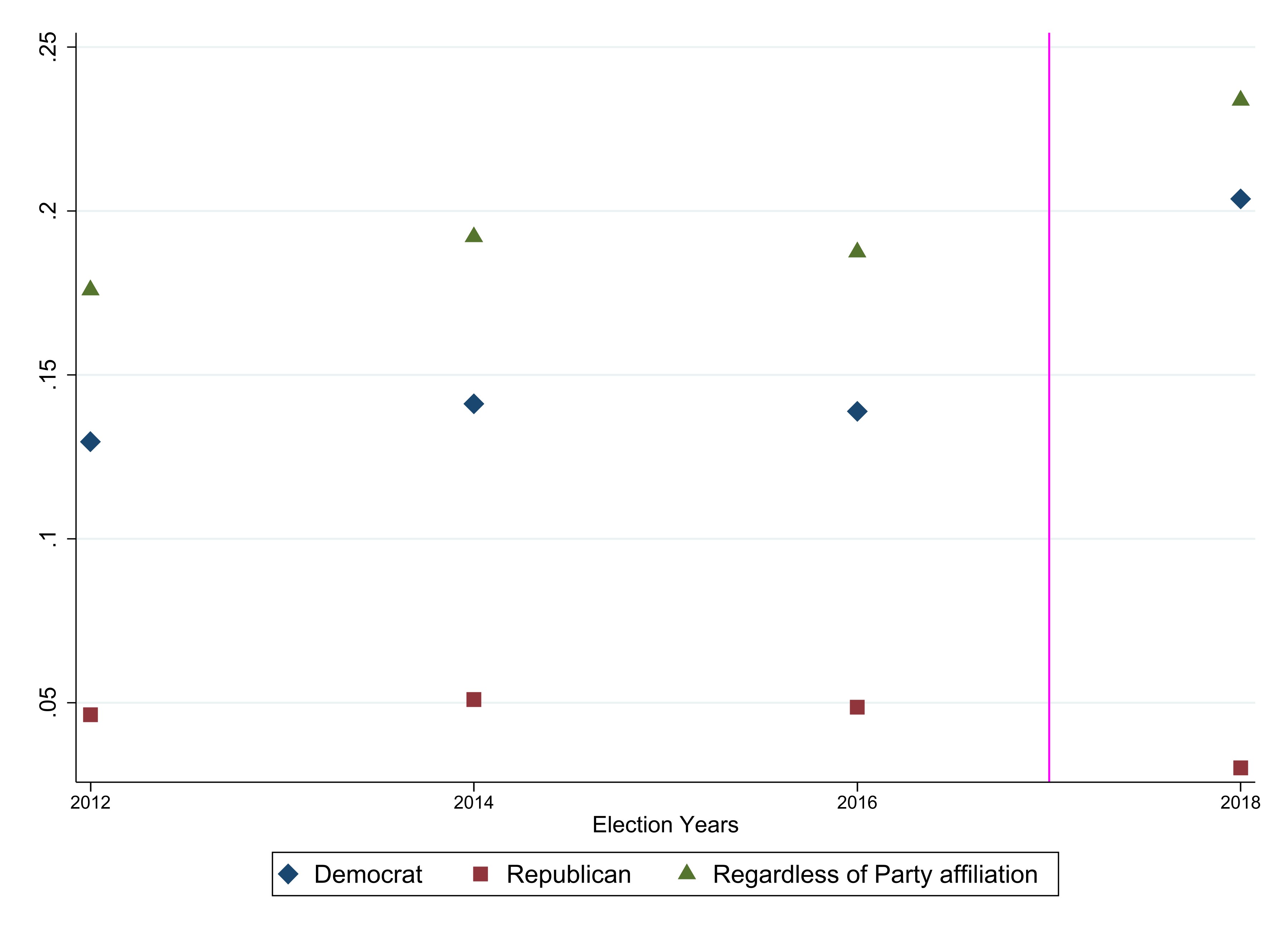 La marcia americana potrebbe aver segnato un punto di rottura per quanto riguarda l’accettazione sociale delle donne come leader politici e la loro volontà di partecipare ai processi decisionali istituzionali. Le figure 1, 2 e 3 mostrano l’andamento storico della partecipazione femminile alla Camera dei Rappresentanti del Congresso statunitense. Rappresentano rispettivamente: la frazione di distretti elettorali dove è stata eletta una donna, la frazione di distretti con almeno una candidata donna nelle primarie e la frazione di donne candidate nelle primarie. La linea rosa rappresenta la Marcia delle Donne del 2017. È possibile notare una discontinuità temporale dopo di essa, come se politicamente esistesse un “prima” e un “dopo”.