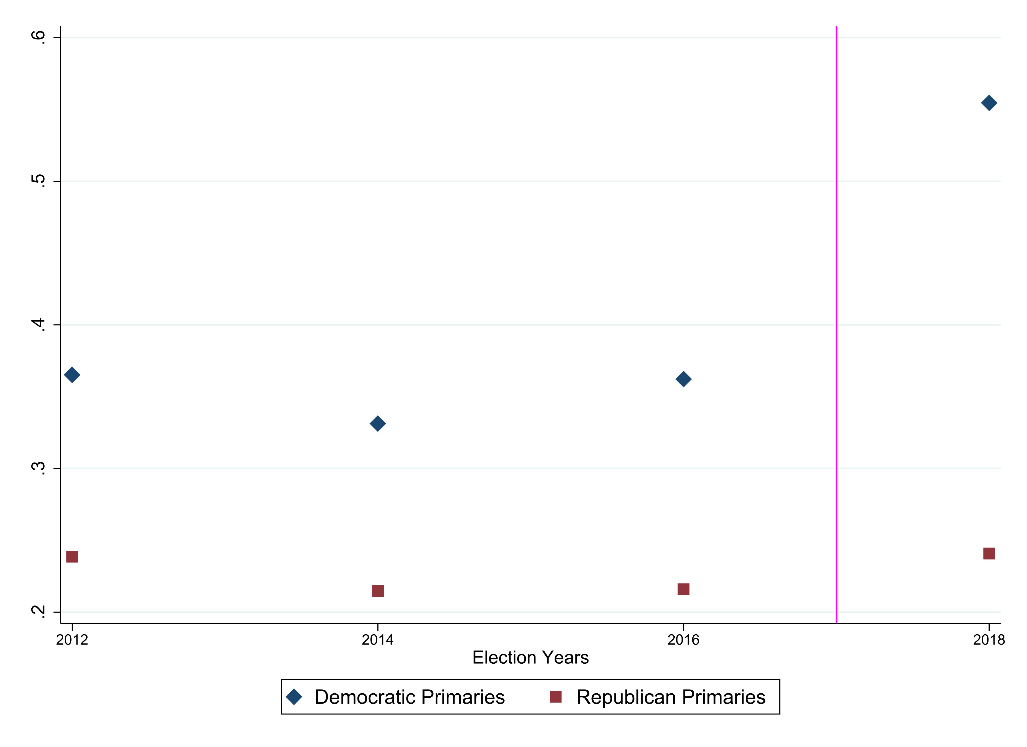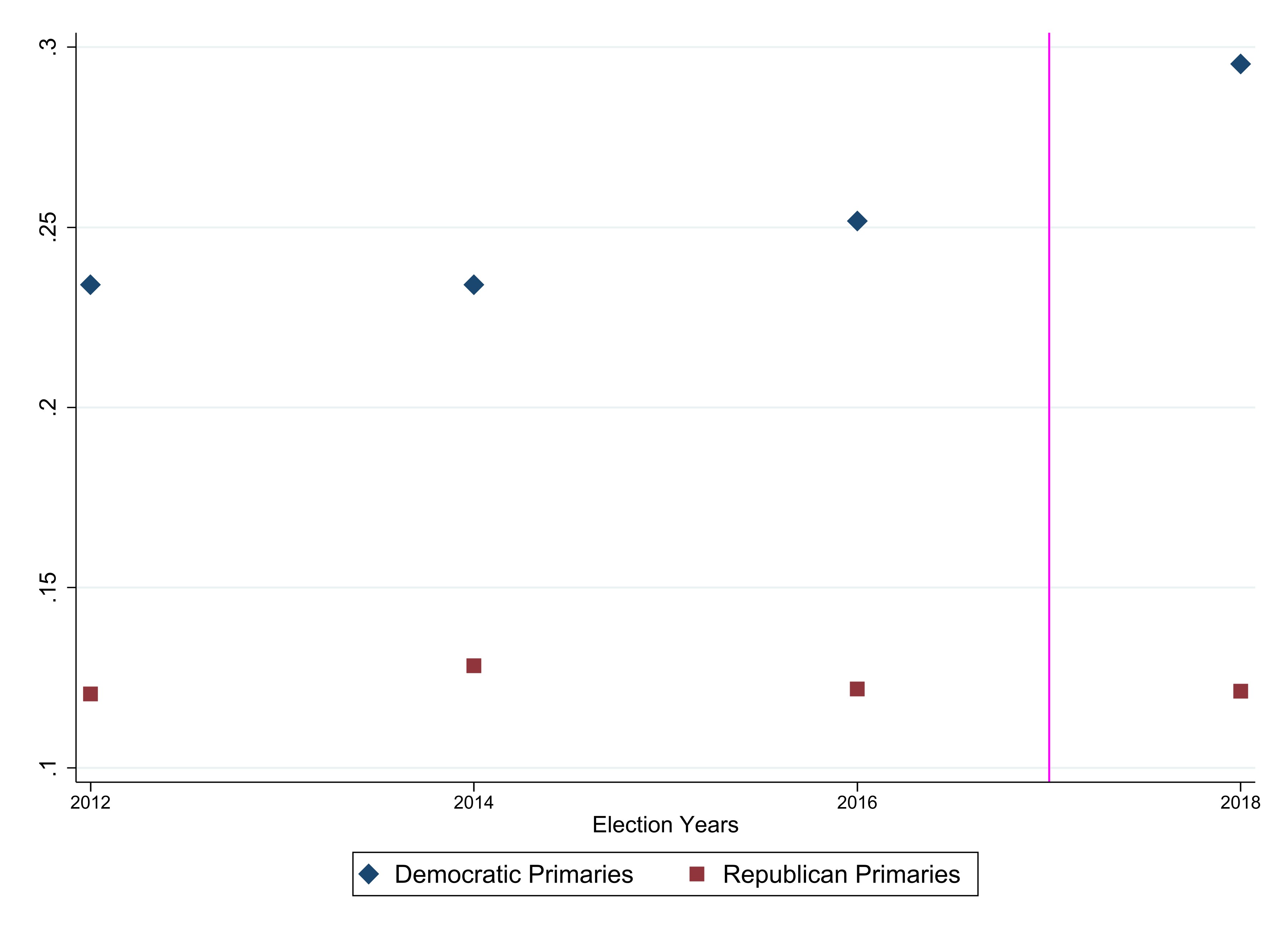 Figura3. Andamento storico della frazione di donne candidate nelle primarie partitiche del Congresso statunitense