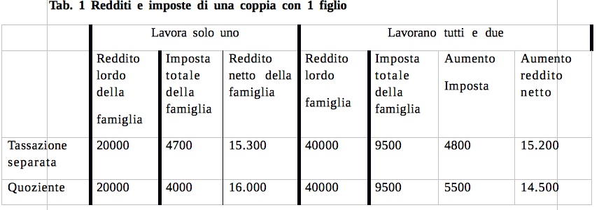 In regime di quoziente famigliare, se lavorasse solo lui, nel nostro esempio l’imposta sarebbe di 4000€, con un’incidenza media del 20%2. Qualora lei decidesse di lavorare a sua volta guadagnando 20.000 €, per la coppia nel suo insieme l’imposta totale ammonterebbe a 9.500€, esattamente come nel caso della tassazione separata. Però il calcolo costi-benefici che viene fatto per decidere se a lei convenga o meno lavorare dà risultati diversi. Infatti in questo regime il reddito lordo passa da 20.000 a 40.000 € come nel caso precedente, ma l’imposta per la famiglia nel suo complesso passa da 4.000 a 9.500 €; quindi l’incremento netto del reddito è 14.500 €, cioè 700€ in meno che nel caso precedente. In questo caso perciò diminuisce la differenza tra i benefici di andare a lavorare (l’incremento di reddito della famiglia al netto delle imposte) e i costi (spese sostitutive del lavoro domestico e/o peggioramento della qualità della vita). L’incentivo al lavoro femminile è minore.