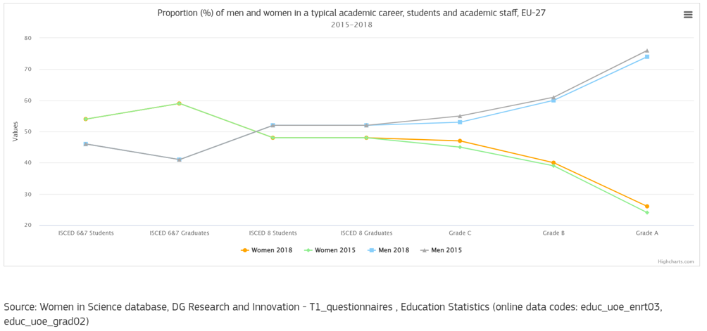 Inoltre, è di nuovo confermato il progressivo abbandono delle donne nelle diverse fasi di carriera. Il fenomeno è chiamato leaky pipeline (tubatura che perde) e insieme al glass ceiling effect (soffitto di cristallo) che impedisce alle donne di assumere ruoli decisionali e quindi di accedere alle posizioni più alte della carriera, produce il grafico a forbice sotto riportato: un aumento di donne laureate non porta automaticamente a un aumento di donne ricercatrici, soprattutto nelle posizioni apicali.[4] Ciò significa che le donne rappresentano in media più della metà delle persone laureate, più del 40% del personale accademico, ma costituiscono solo un quarto (26,2%) dei docenti ordinari.