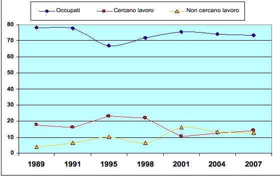 Se si allarga il periodo d’osservazione, l’evoluzione della condizione occupazionale delle diverse leve di laureati dal 1989 al 2007 suggerisce che la crisi economica degli ultimi anni ha interrotto una moderata tendenza al miglioramento (v. figura 1)3. Dal 1989 al 1995 si osserva un generale peggioramento, con un calo degli occupati, un aumento dei disoccupati ed degli inattivi (i cosiddetti NEET)4. A partire dal 1995 si registra una inversione di tendenza con un parziale miglioramento: aumenta la quota di occupati (che raggiunge il 74% per la leva del 2004) e si riduce quella dei laureati in cerca di lavoro (che scende al 10,4% per la leva del 2001). La crisi economica ha pertanto interrotto la tendenza, peraltro moderata, verso un migliore inserimento professionale dei laureati: la quota di occupati è tornata a ridursi (seppur di poco) e quella di chi cerca lavoro ha ripreso ad aumentare. Ed è probabile che tali dati siano sottostimati, per l'allungamento dell'intervallo temporale delle rilevazioni a cui si è fatto cenno prima: il che implicherebbe che l’impatto della crisi sulla nuova leva di laureati è anche maggiore di quel che vediamo nella figura 1.