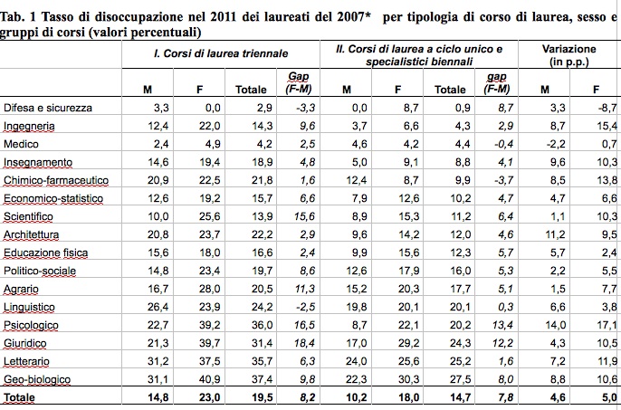 In generale, qualsiasi sia i titolo di studio conseguito, si osserva un sistematico svantaggio femminile nell’accesso al lavoro, con più elevati tassi di disoccupazione, che però non è uniforme tra i diversi corsi di laurea e i vari ambiti disciplinari.